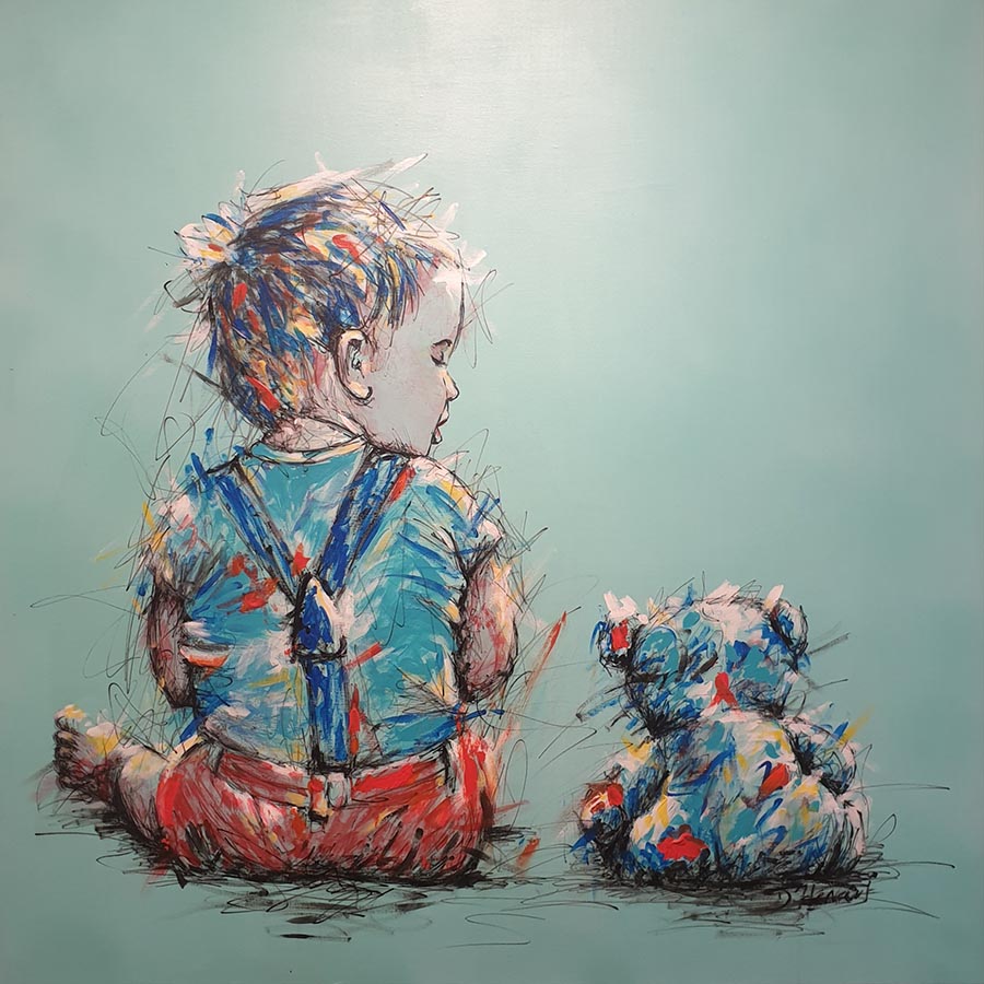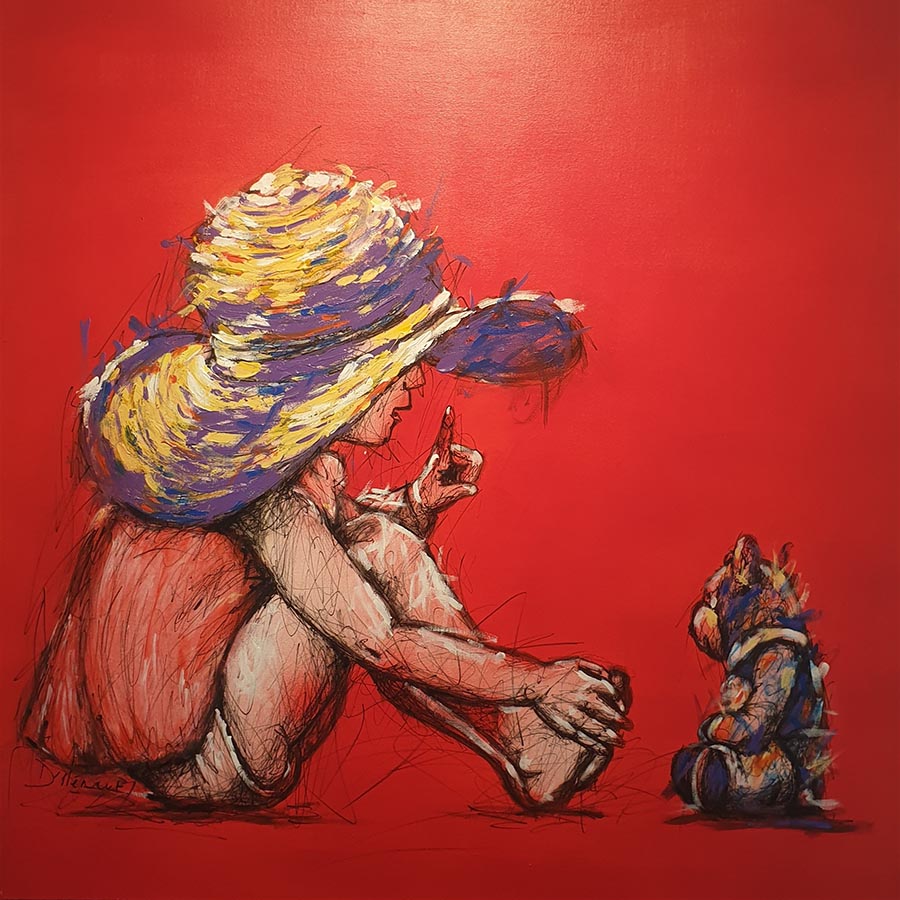 Par ses tracés à grands traits, aux feutres, à l’encre de Chine, et ses fonds colorés, elle donne vie à ses toiles.